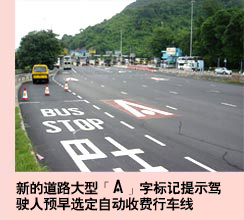 字 标 记 , 指 引 驾 驶 者 驶 向 自 动 收 费 正 确 行 车