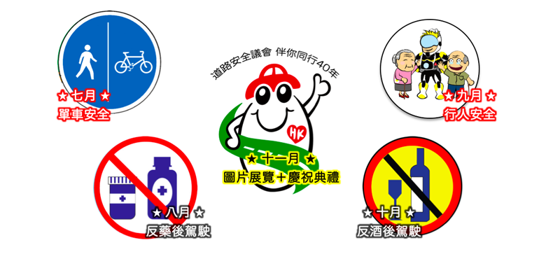 議會就近年幾個令人關注的道路安全事項訂立了四大工作重點,包括反藥後駕駛、反酒後駕駛、單車安全及行人安全。所以議會希望藉此40 周年推廣的機會,由今年七月開始為這四大主題來舉辦一連串的宣傳活動。